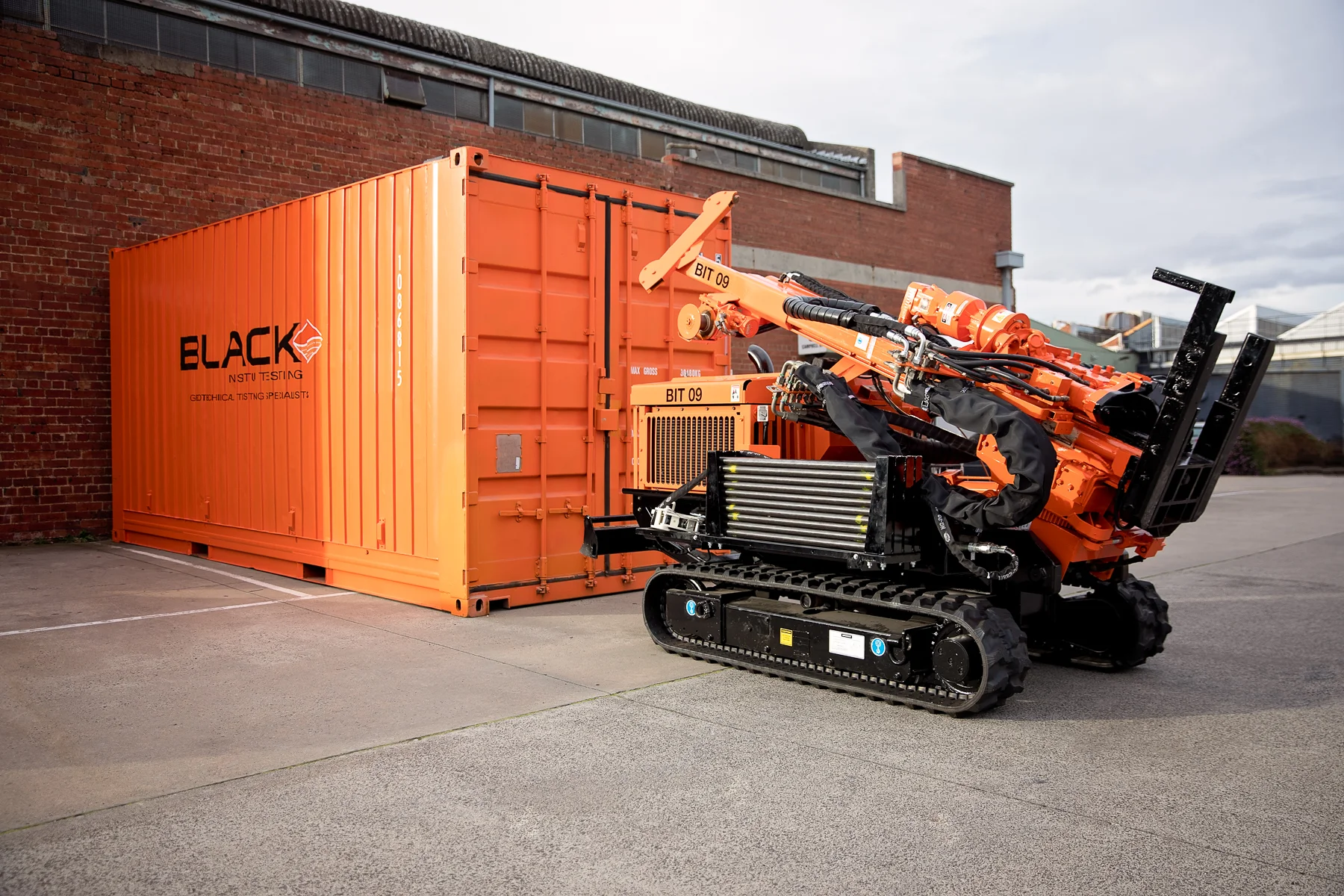 The Geoprobe 7822DT CPT rig is a compact tracked machine that weighs about 4 tonne and is suited for CPTs in difficult site access conditions. It has up to 20 tonnes of thrust available with ground anchors installed to provide reaction and predrilling ability.